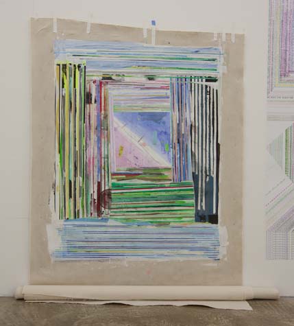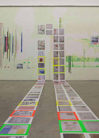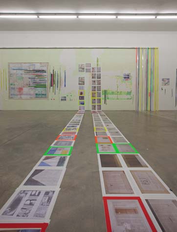 Mixed media installation featuring pairs of works in which each part of the pair offered a consideration of the other. The conceptual possibilities of temporal expansion and contraction were emphasized through the physical and temporal doublings. For example, textmindfloormind was a pair of types of laminated 9” x 11” digital prints adhered to the floor. The laminations contained the rephotographed press releases from Greater New York 2010 (MoMA PS1), timecompressionmachine (photographs were taken after three months of foot traffic and thus worn and torn). This rephotographing of the past extended the temporal, and the lamination of the new pairs alluded to ideas of the archival. One group of laminations included all the the photographs of the press releases with images cut from the press releases. The second group of laminations included all the images that were cut from each press release, printed to a new dimension of 9” x 11”, a significant increase over the original scale of the image. Other pairs in the installation included: 1. a painting of acrylic on canvas with a trompe l’oeil watercolor painted in the center and its pair, a wall painting at the same dimension with a physical watercolor on paper in the center, making a double image; 2. painted tape screens dividing the space and the same quantity of tape rolls unrolled and clustered on the floor; 3. 72” x 72” acrylic on canvas and 14” x 14” watercolor on paper of similar images but different media and scale. |